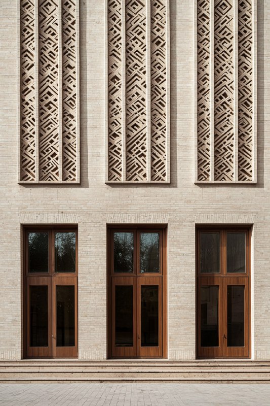 A minimalist building facade made of beige…