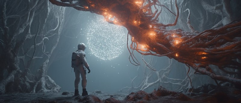 Home » Home Digitals » Cinematic film still of astronaut trapped by…