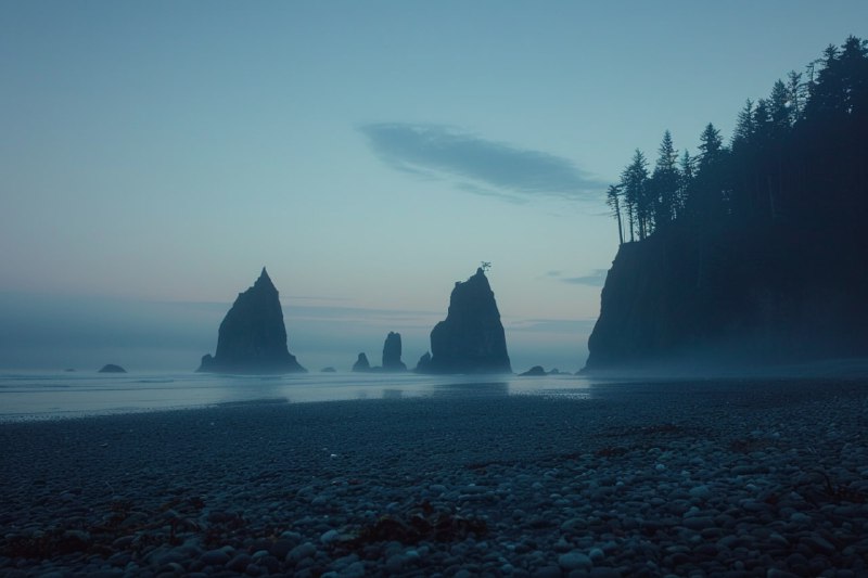 Seastacks rise from misty waters at twilight…